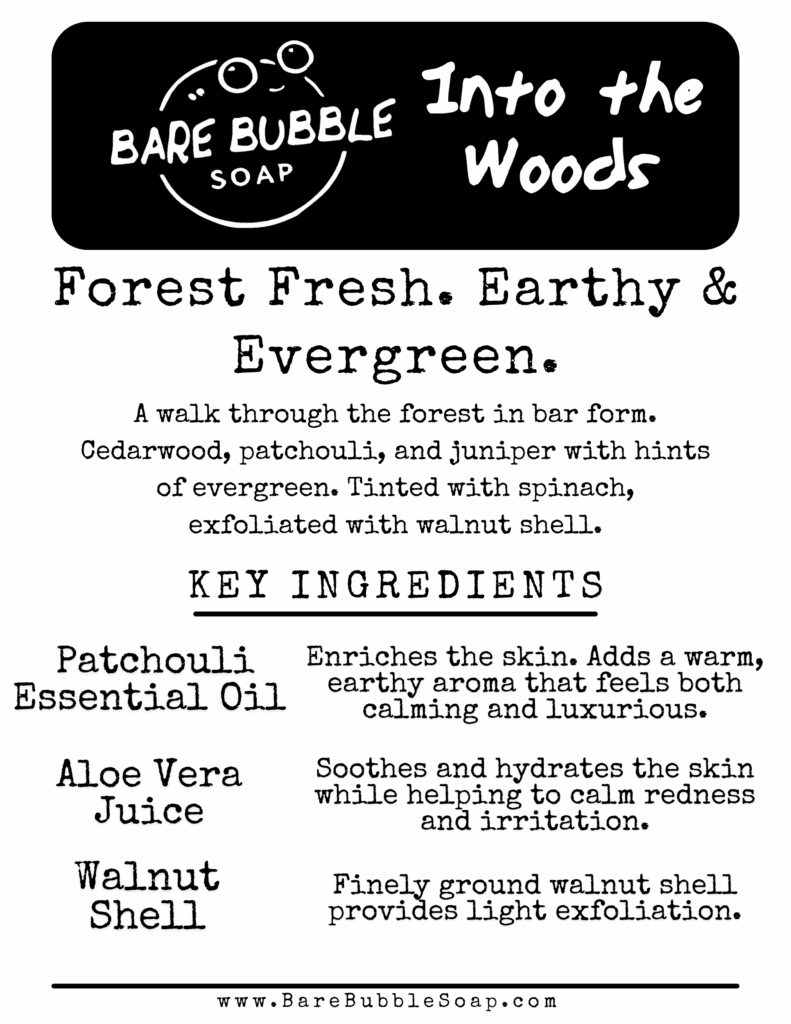 A walk through the forest in bar form. Cedarwood, patchouli, and juniper with hints of evergreen. Tinted with spinach, exfoliated with walnut shell.